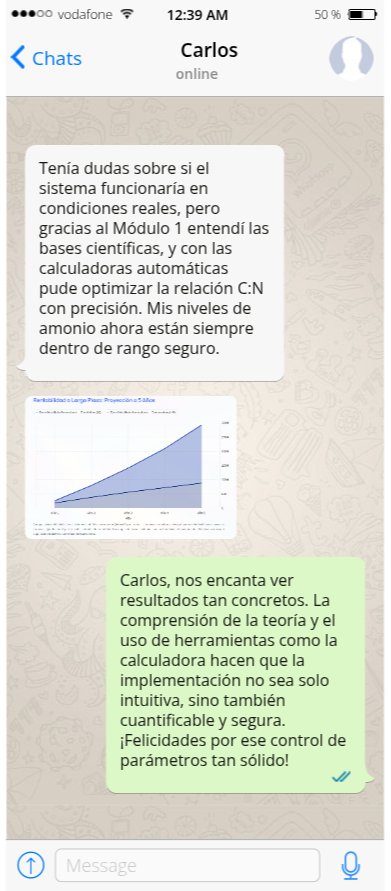Ferramenta automática para calcular NH3 tóxico, ajustar relação C:N e avaliar nível de risco do sistema. Ajuda a manter estabilidade e evitar colapsos produtivos.